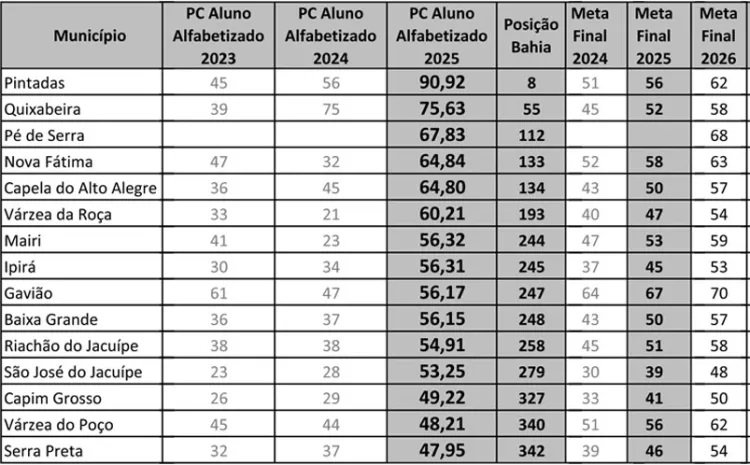 Por outro lado, Pintadas registrou o melhor desempenho no território, com índice de 90,92% de estudantes alfabetizados.