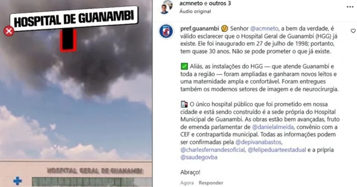 Segundo o Achei Sudoeste, parceiro do Bahia Notícias, na resposta, a gestão municipal declarou que a unidade de saúde já existe e funciona há décadas. O Hospital Geral de Guanambi foi inaugurado em 27 de julho de 1998. “É válido esclarecer que o Hospital Geral de Guanambi já existe. Não se pode prometer o que já está em funcionamento”, postou a prefeitura.